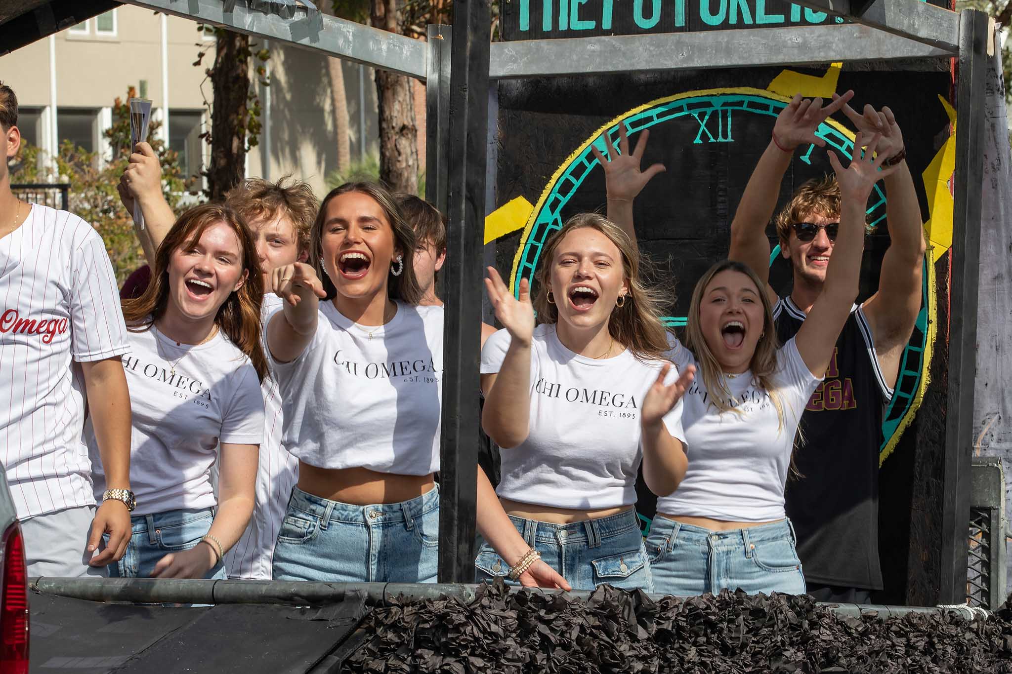 FSU Chi Omega sorority members ride a float in the 2023 homecoming parade. The university recently created a center to support holistic student development in Greek organizations.